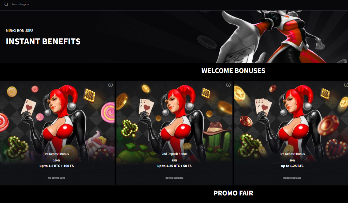 Promotions at MIRAX Casino start from a four-part welcome bonus of up to 5 BTC and 150 FS. New game bonuses, reload bonuses, free spins, and a highroller cashback of up to 20% are part of the casino’s promotions list. Beyond these deals, the casino also has a strong VIP program that offers several perks and benefits.