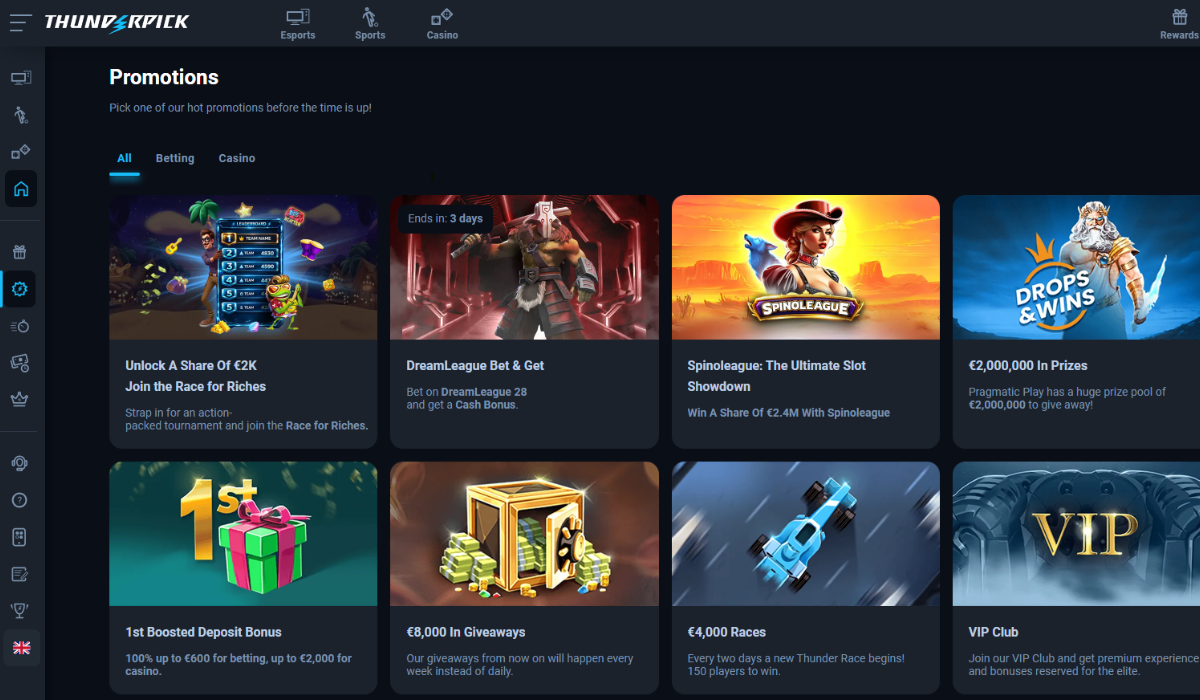 Thunderpick welcomes new players with a 100% first deposit boost of up to €2,000 (casino) and €600 (betting). Other promotions include €8,000 in Giveaways, €4,000 in Races, VIP rewards, referral bonuses, and two tournaments with behemoth prize pools, namely, Drops & Win (€2,000,000) and Spinoleague (€2.4M).