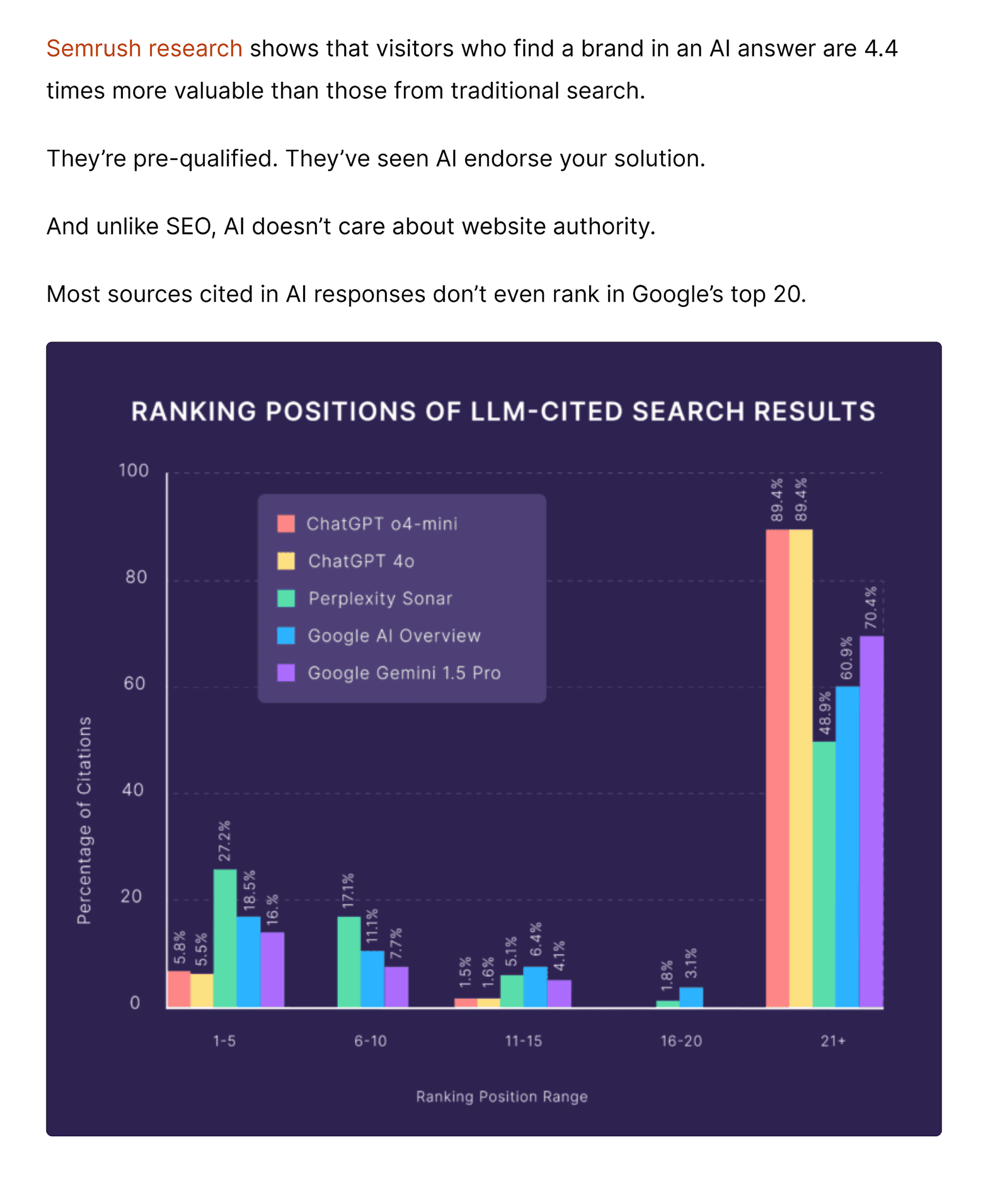 This means it’s no longer enough to rank on Google; your content also needs to surface in AI-generated answers.