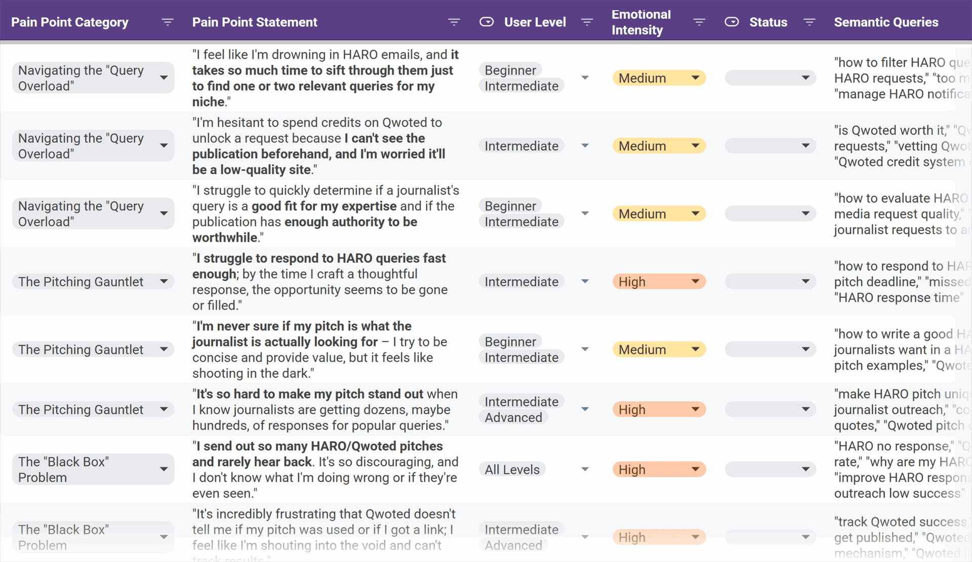 After using this prompt for the topic “journalist outreach,” Michael received a helpful list of pain points mapped to user level and emotional intensity.